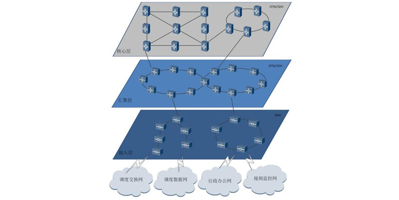 公司的通信系統(tǒng)集成方案采用核心層、匯聚層和接入層三級網(wǎng)絡(luò)構(gòu)架,三級網(wǎng)絡(luò)主要由OTN、SDH、XPON、CPE等設(shè)備部署構(gòu)成,具有承載業(yè)務(wù)多樣、網(wǎng)絡(luò)結(jié)構(gòu)簡單、網(wǎng)元管理便捷、系統(tǒng)性能穩(wěn)定等特點(diǎn)。
